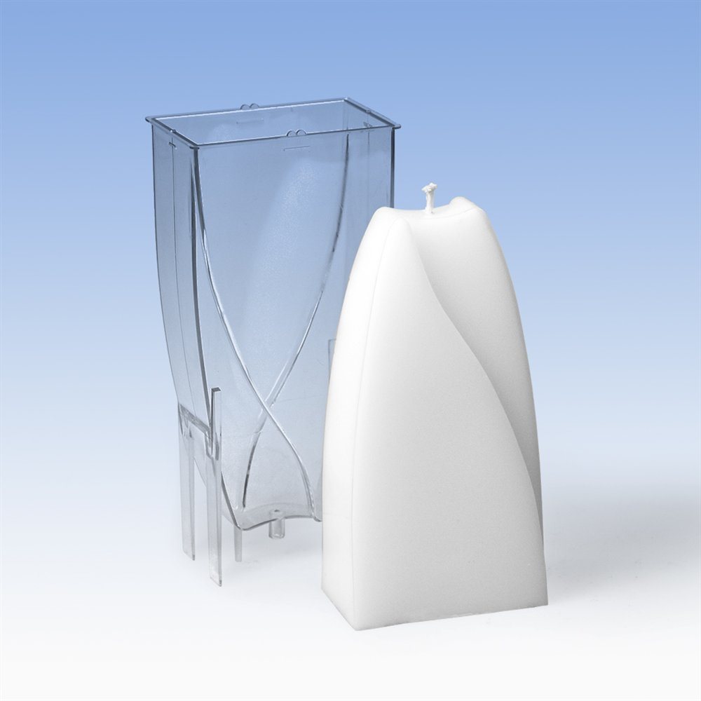 Polycarbonat, transparent. Zum Giessen von Paraffin- und Paraffin/Stearin-Kerzen (hitzebeständig bis 120°C). Der angegebene Flachdocht bezieht sich auf Paraffin- und Paraffin/Stearin-Wachs.