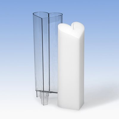 Polycarbonat, transparent. Zum Giessen von Paraffin- und Paraffin/Stearin-Kerzen (hitzebeständig bis 120°C). Der angegebene Flachdocht bezieht sich auf Paraffin- und Paraffin/Stearin-Wachs.