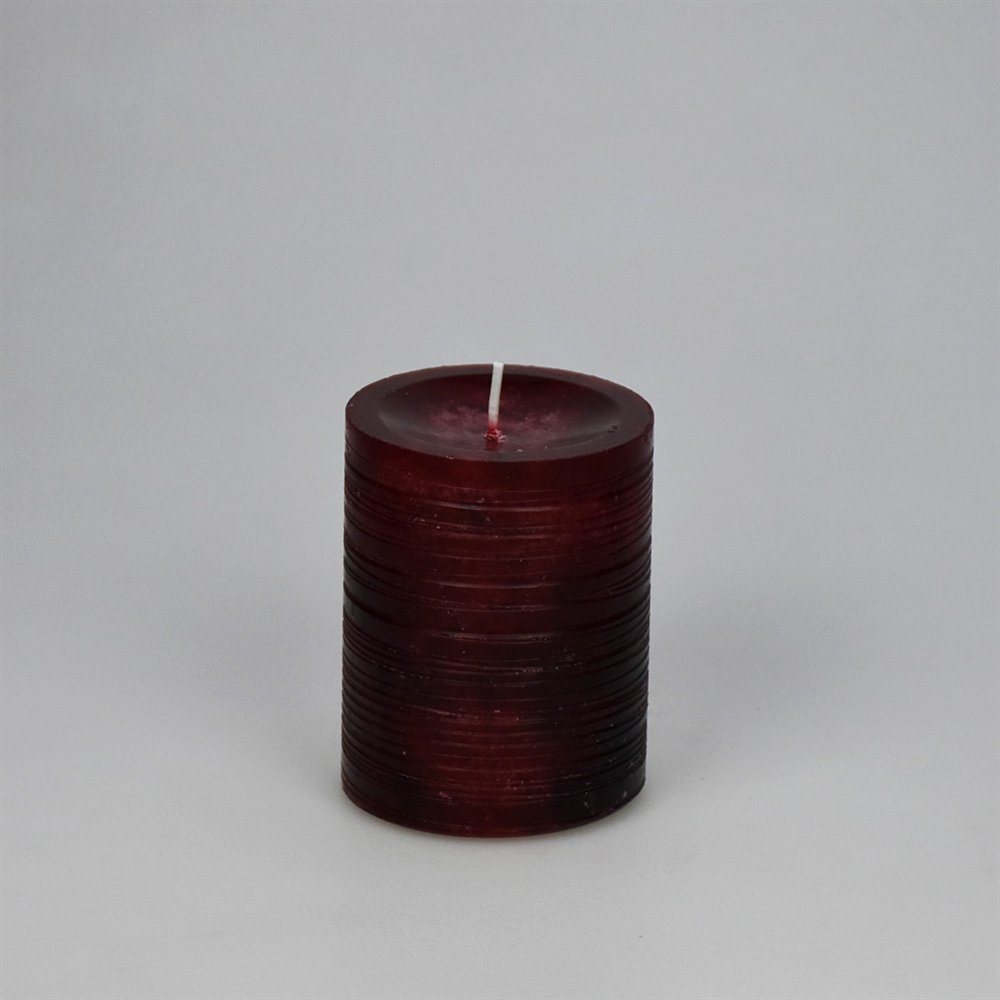 Handgegossene Kerze mit gerillter Oberfläche (feine Querrille). Durchgefärbt, hell/dunkel marmoriert.