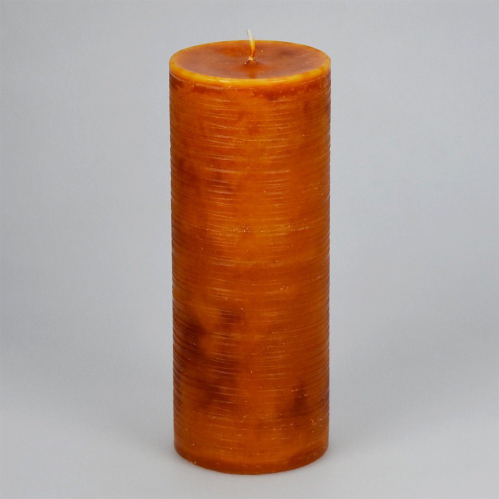 Handgegossene Kerze mit gerillter Oberfläche (feine Querrille). Durchgefärbt, hell/dunkel marmoriert. Die brennende Kerze bringt den Kerzenkörper zum Leuchten.