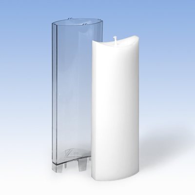 Polycarbonat, transparent. Zum Giessen von Paraffin- und Paraffin/Stearin-Kerzen (hitzebeständig bis 120°C). Der angegebene Flachdocht bezieht sich auf Paraffin- und Paraffin/Stearin-Wachs.
