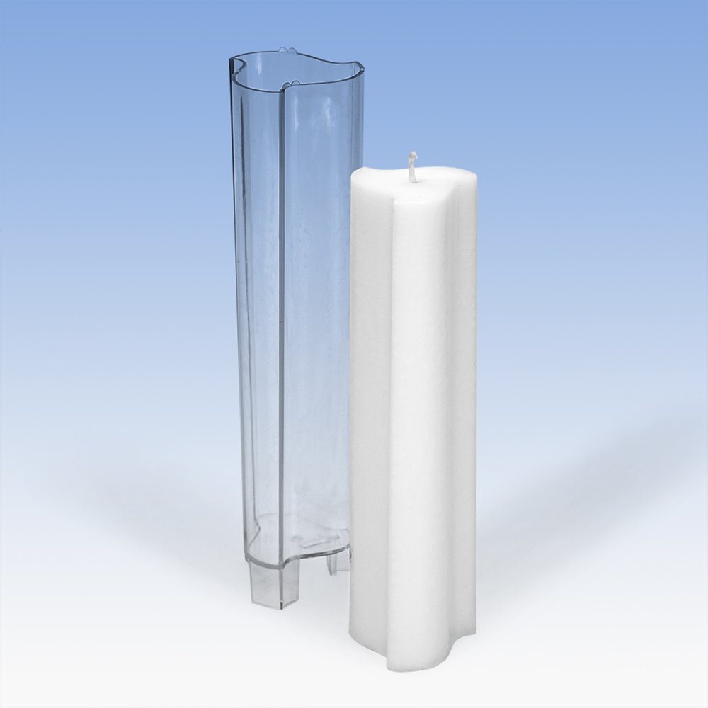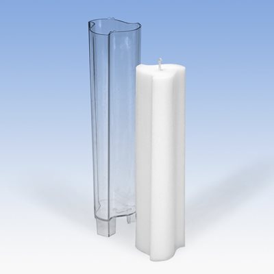 Polycarbonat, transparent. Zum Giessen von Paraffin- und Paraffin/Stearin-Kerzen (hitzebeständig bis 120°C). Der angegebene Flachdocht bezieht sich auf Paraffin- und Paraffin/Stearin-Wachs.