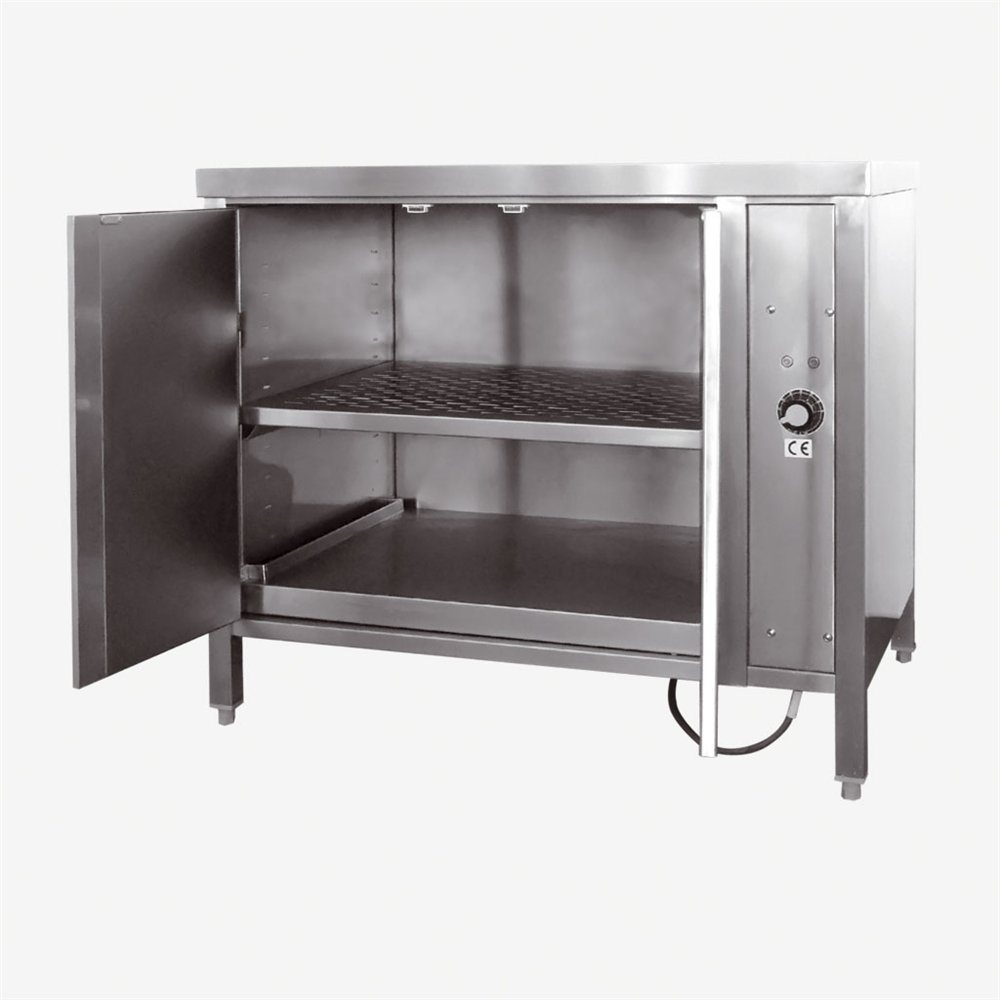 Aus robustem Edelstahl, zwei Flügeltüren, Zwischenbord, ein höhenverstellbares Tablarböden, stufenlose Temperaturregelung 30-85 °C
