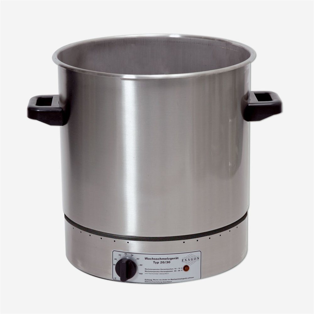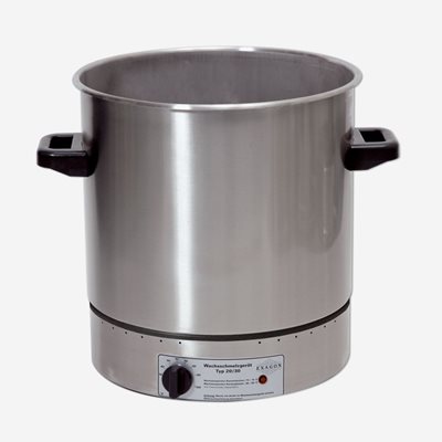 Wachsschmelzgerät Typ 30Direktbeheiztes, abgedecktes Wasserbad. 2 Jahre Garantie. Integrierte Elektroheizung, Temperaturregelung 30 bis 100 °C, Sicherheitsthermostat, Kontrollleuchte. Griffe in Kunststoff, Pfanne und Bodenteil in Edelstahl.