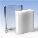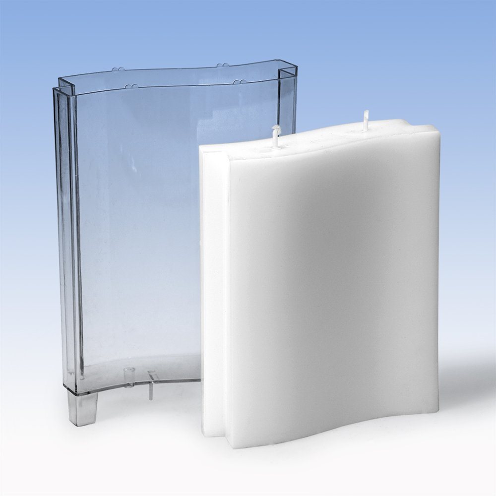 Polycarbonat, transparent. Zum Giessen von Paraffin- und Paraffin/Stearin-Kerzen (hitzebeständig bis 120°C). Der angegebene Flachdocht bezieht sich auf Paraffin- und Paraffin/Stearin-Wachs.