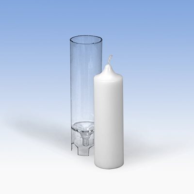 Polycarbonat, transparent. Zum Giessen von Paraffin- und Paraffin/Stearin-Kerzen (hitzebeständig bis 120°C). Der angegebene Flachdocht bezieht sich auf Paraffin- und Paraffin/Stearin-Wachs.