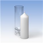 Polycarbonat, transparent. Zum Giessen von Paraffin- und Paraffin/Stearin-Kerzen (hitzebeständig bis 120°C). Der angegebene Flachdocht bezieht sich auf Paraffin- und Paraffin/Stearin-Wachs.
