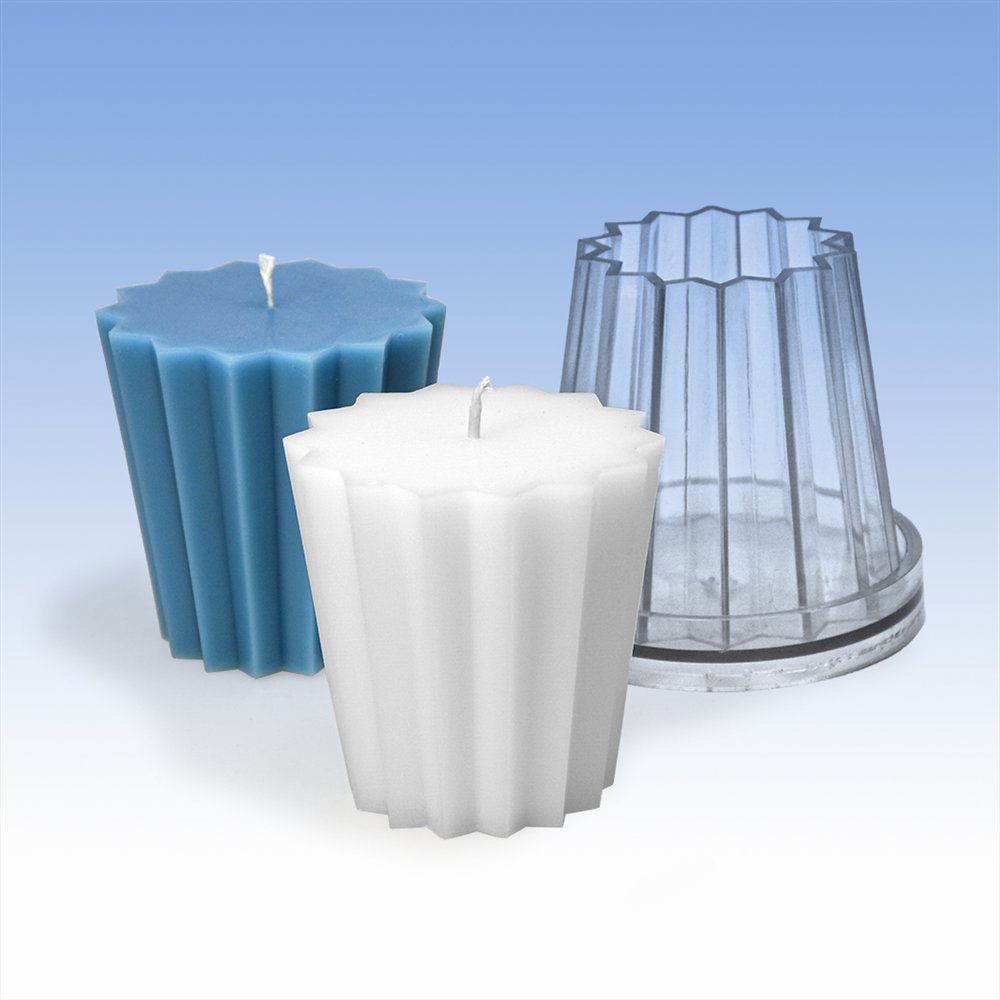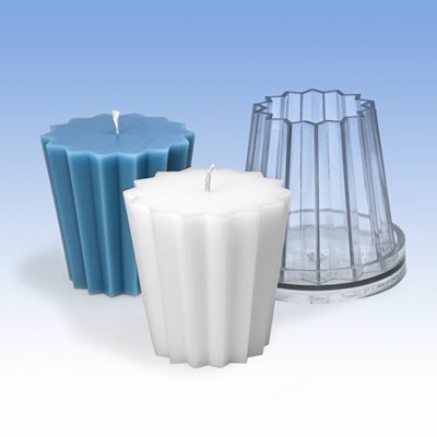 Two-part, with flat lid. This mould comes with a special needle for tensioning and holding the wick in place. With instructions!