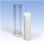Polycarbonate, transparent. For pouring paraffin and paraffin/stearin candles (heat-resistant up to 120°C). The specified flat wick refers to paraffin and paraffin/stearin wax.