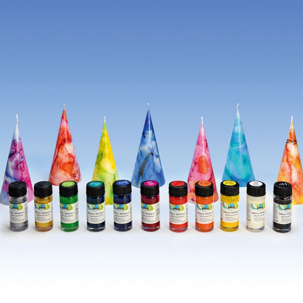 For marbling candles, wax lights and decorative wax. Can also be used for other materials such as paper, glass, metal and plastic.