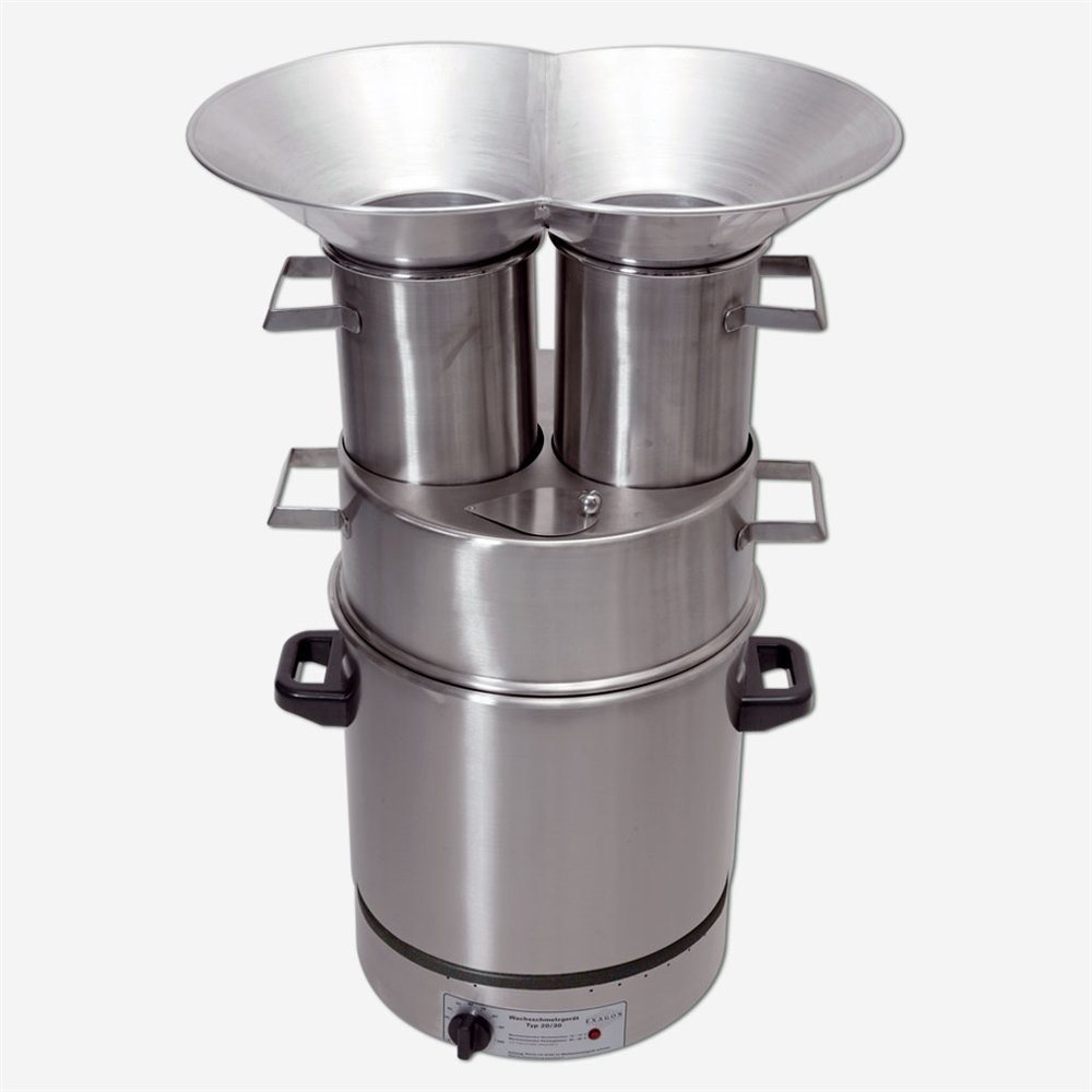 A Type 30 wax melter with a two-hole cover, two size-4 melting pots and a twin dripring. No soiling of double boiler, low electricity consumption.