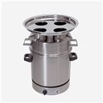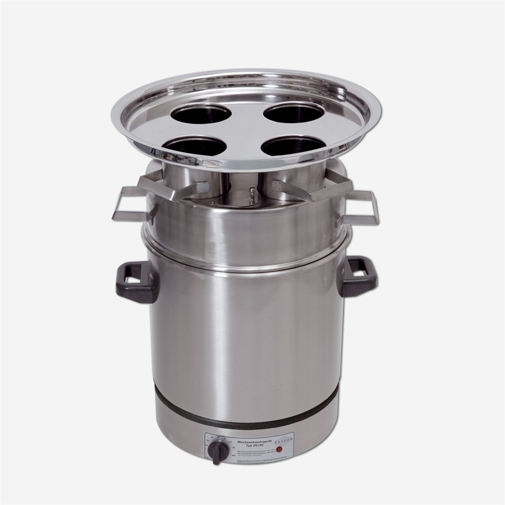 A Type 30 wax melter in combination with the special cover, four size-2 melting pots and a drip ring. Low electricity consumption, no soiling of the double boiler.