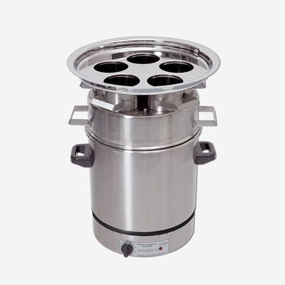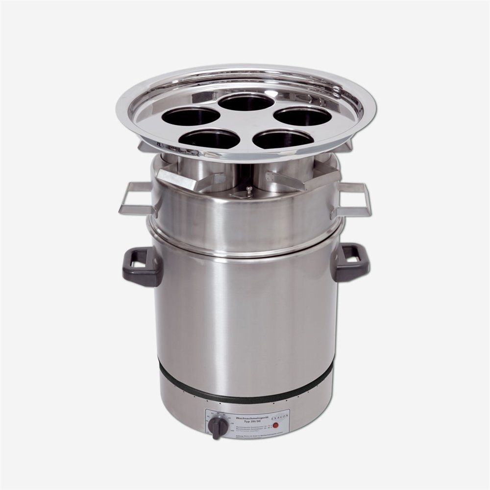 A Type 30 wax melter in combination with the special cover, five size-2 melting pots and a drip ring. Low electricity consumption, no soiling of the double boiler.