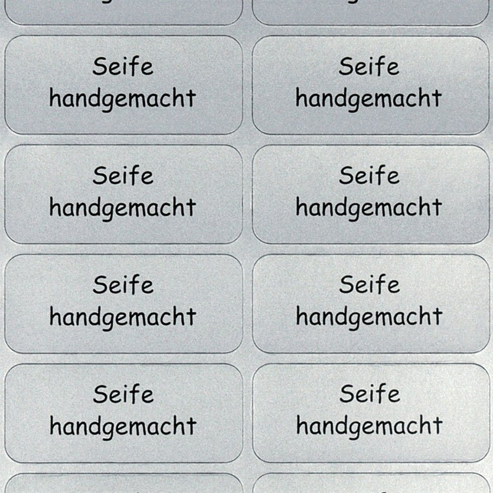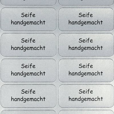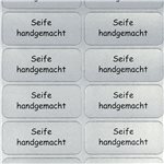 Impression en noir sur fond argent. Les étiquettes sont aussi disponibles en français. (Art. 73201)